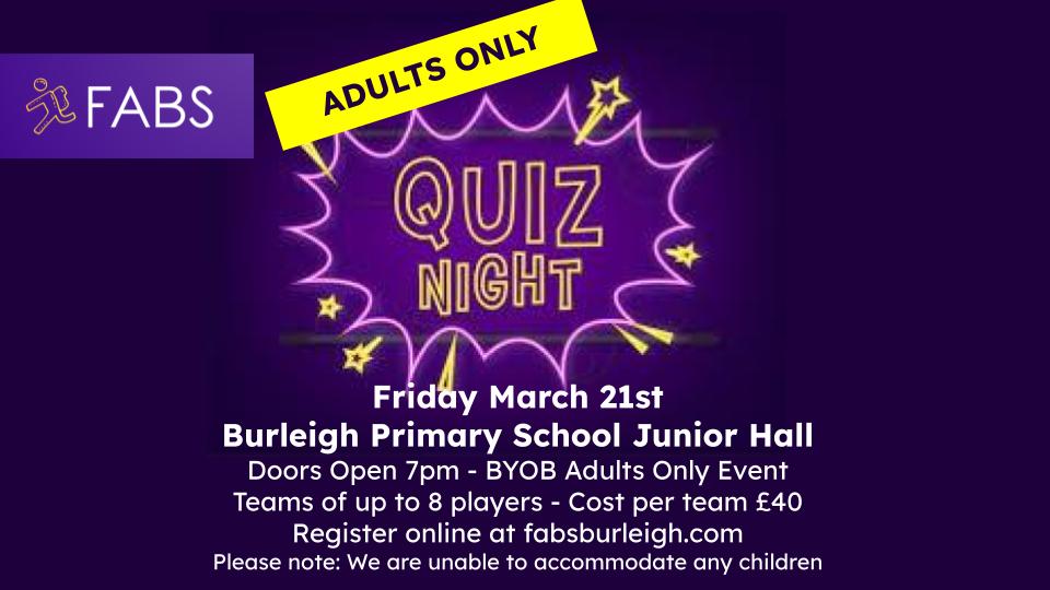 Who says the kids should have all the fun?!? The FABS team are hosting a Parents/ Adults Only Quiz Night on Friday March 21st – the chance to enjoy the company of our parenting and local Cheshunt community and friends. Each team may have a maximum of 8 players, and the entrance fee per team is £40. This event is BYOB – bring your own beverages. The Quiz Night doors will open at 7pm at the Burleigh Primary School Junior Hall. All proceeds from the event will go to the FABS £10k fundraising effort. The winning trivia team (aside from glory and bragging rights) gets a wonderful prize to share.