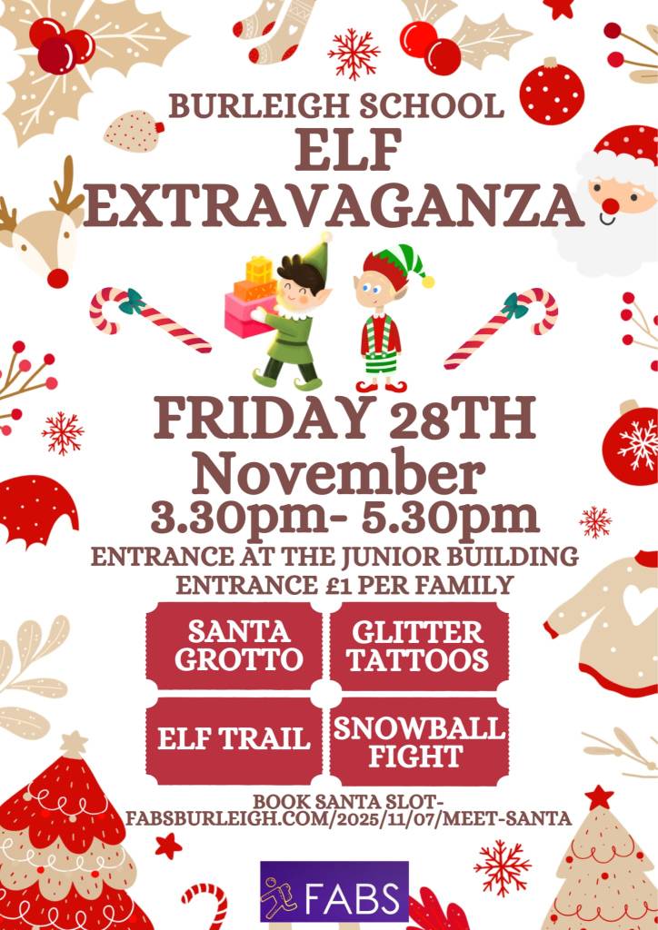 This event is free for children to attend, but we ask that adults pay £1 either in cash on the day or in advance online here – https://fabsburleigh.sumupstore.com/product/elf-extravaganza-entrance-adult-entrance. If you purchase in advance before Friday we can have a wristband available for you to to pick up on Thursday or Friday at the school’s main reception. By purchasing in advance we can expedite your entrance. Children will not be allowed to enter the event unless they are accompanied by an adult.